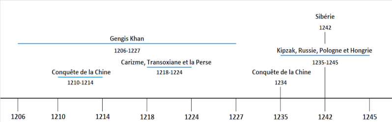 Conquête de Carizme, de la Transoxiane et de la PerseRetrouvez le résumé de cette partie au sein du synopsis : L'empire grec de 408 à 705Vers l'Occident, ses possessions touchaient aux frontières de Mohammed, sultan de Carizme, dont les vastes Etats s'étendaient depuis le golfe Persique jusqu'aux limites de l'Inde et du Turkestan, et qui, ambitieux d'imiter Alexandre le Grand, avait oublié la sujétion et l'ingratitude de ses ancêtres envers la maison de Seljouk. Gengis, dans l'intention d'entretenir une liaison de commerce et d'amitié avec le plus puissant des princes musulmans, rejeta les sollicitations secrètes du calife de Bagdad, qui voulait sacrifier l'Etat et sa religion à sa vengeance personnelle. Mais un acte de violence et d'inhumanité attira justement les armes des Tartares dans l'Asie méridionale. Mohammed fit arrêter et massacrer à Otrar une caravane composée de trois ambassadeurs et de cent cinquante marchands. Ce ne fut cependant qu'après la demande et le refus d'une satisfaction, après avoir prié et jeûné durant trois nuits sur une montagne, que l'empereur mongoul en appela au jugement de Dieu et de son épée. Nos batailles d'Europe, dit un écrivain philosophe, ne sont que de faibles escarmouches; si nous les comparons aux armées qui combattirent et périrent dans les plaines de l'Asie. Sept cent mille Mongouls ou Tartares marchèrent, dit-on, sous les ordres de Gengis et de ses quatre fils; ils rencontrèrent dans les vastes plaines qui s'étendent au Nord du Sihon on Jaxartes, le sultan Mohammed à la tête de quatre cent mille guerriers; et dans la première bataille qui dura jusqu'à la nuit, cent soixante mille Carizmiens, perdirent la vie. Mohammed, surpris du nombre et de la valeur de ses ennemis, fit sa retraite et distribua ses troupes dans les villes de ses frontières, persuadé que ces Barbares, invincibles sur le champ de bataille, se laisseraient rebuter par la longueur et la difficulté d'un si grand nombre de sièges réguliers; mais Gengis avait sagement formé un corps d'ingénieurs et de mécaniciens chinois, instruits peut-être du secret de la poudre, et capables d'attaquer sous sa discipline un pays étranger avec plus de vigueur et de succès qu'ils n'avaient défendu leur patrie. Les historiens persans racontent les sièges et la réduction d'Otrar, Cogende, Bochara, Samarcande, Carizme, Hérat, Merou, Nisabour, Balch et Candahar, et la conquête des riches et populeuses contrées de la Transoxiane, de Carizme et du Khorasan: les ravages de Gengis et des Mongouls nous ont déjà servi à donner une idée de ce qu'avaient pu être les invasions des Huns et d'Attila, et je me contenterai d'observer que depuis la mer Caspienne jusqu'à l'Indus, les conquérants convertirent en un désert étendue de plusieurs centaines de milles, que la main des hommes avait cultivée et ornée de nombreuses habitations, et que cinq siècles n'ont pas suffi à réparer le ravage de quatre années. L'empereur mongoul encourageait ou tolérait les fureurs de ses soldats: emportés par l'ardeur du carnage, et celle du pillage, ils oubliaient toute idée de jouissance future, et la cause de la guerre excitait encore leur férocité par les prétextes de la justice et de la vengeance. La chute et la mort du sultan Mohammed, qui, abandonné de tous et sans exciter de pitié, expira dans une île déserte de la mer Caspienne, sont une expiation des calamités dont il fut l'auteur. Son fils Gelaleddin arrêta souvent les Mongouls dans la carrière de la victoire; mais la valeur d'un seul héros ne suffisait pas pour sauver l'empire des Carizmiens: écrasé par le nombre dans une retraite qu'il faisait, sur les bords de l'Indus. Gelaleddin poussa son cheval au milieu des flots; et, traversant avec intrépidité le fleuve le plus rapide et le plus large de l'Asie, il excita chez son vainqueur un mouvement d'admiration. Ce fut après cette victoire que l'empereur mongoul, cédant à regret aux murmures de ses soldats enrichis et fatigués, consentit à les ramener dans leur terre natale. Chargé des dépouilles de l'Asie, il retourna lentement sur ses pas, laissa voir quelque pitié pour la misère des vaincus, et annonça l'intention de rebâtir les villes détruites par son invasion. Au-delà de l'Oxus et du Jaxartes, les deux généraux qu'il avait détachés avec trente mille hommes de cavalerie pour réduire les provinces méridionales de la Perse, joignirent son armée. Après avoir renversé tout ce qui s'opposait à leur passage, forcé le défilé de Derbend, traversé la Volga et le désert, et fait le tour entier de la mer Caspienne, ils revenaient triomphants d'une expédition dont l'antiquité n'offrait pas d'exemples, et qu'on n'a jamais essayé de renouveler. (Mort de Gengis Khan; 1227) Gengis signala son retour par la défaite de tout ce qui restait de peuples tartares rebelles ou indépendants, et mourut plein d'années et de gloire (1227), en exhortant ses fils à achever la conquête de la Chine. Le harem de Gengis renfermait cinq cents femmes ou concubines, et parmi sa nombreuse postérité, il avait choisi quatre de ses fils, illustres par leur mérite autant que par leur naissance qui exerçaient sous leur père les principaux emplois civils et militaires. (Conquêtes des Mongols sous les successeurs de Gengis; 1227-1295) Toushi était son grand veneur, Zagatai son juge, Octai son ministre, et Tuli son général. Leurs noms et leurs actions se font souvent remarquer dans l'histoire de ses conquêtes. Fermement unis par le sentiment de leur intérêt et de l'intérêt public, trois de ces frères ainsi que leurs familles se contentèrent de royaumes dépendants, et d'un consentement unanime Octai fut proclamé grand khan ou empereur des Mongouls ou des Tartares. Octai eut pour successeur son fils Gayuk, dont la mort transmit le sceptre de l'empire à ses cousins Mangou et Criblai, fils de Tuli et petits-fils de Gengis. Dans les soixan