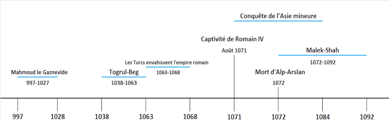 Moeurs et émigrations des Turcs ou TurcomansRetrouvez le résumé de cette partie au sein du synopsis : L'empire grec de 408 à 705Dans l'état actuel de dépopulation où se trouve l'Asie, ce n'est qu'aux environs des villes qu'on peut reconnaître l'action régulière du gouvernement et les soins de l'agriculture; le reste du pays est abandonné aux tribus pastorales des Arabes, des Curdes (Kurdes) et des Turcomans. Deux hordes considérables de ceux-ci ont des établissements des deux côtés de la mer Caspienne : la colonie occidentale peut armer quarante mille guerriers; la colonie qui se trouve à l'Orient, moins accessible aux voyageurs, mais plus forte et plus nombreuse, se compose à peu près de cent mille familles. Au milieu des nations civilisées, elles conservent les moeurs du désert de la Scythie, changent de campements avec les saisons, et font paître leurs troupeaux parmi les ruinés des palais et des temples. Ces troupeaux sont leur seule richesse : leurs tentes, blanches ou noires, selon la couleur de la bannière, sont couvertes de feutre et d'une forme circulaire : une peau de mouton est le vêtement d'hiver de ces Barbares; celui d'été est formé d'une robe de drap ou de coton : la physionomie des hommes est grossière et farouche, celle des femmes est douce et agréable. Une vie errante entretient leur esprit et leurs habitudes militaires; ils combattent à cheval, et des querelles très multipliées, entre eux et avec leurs voisins, leur donnent des occasions fréquentes de déployer leur courage. Ils achètent le droit de pâturage au moyen d'un léger tribut au souverain du pays; mais la juridiction domestique appartient aux chefs et aux vieillards. Il paraît que la première migration des Turcomans orientaux, les plus anciens de leur lignée, eut lieu au dixième siècle de l'ère chrétienne. Dans le temps de la décadence des califes et de la faiblesse de leurs lieutenants, la barrière du Jaxartes fut souvent violée : après la retraite ou la victoire qui suivait chaque incursion, quelqu'une de leurs tribus, embrassant la religion de Mahomet, obtenait le droit de camper librement dans les plaines spacieuses et sous le climat agréable de la Transoxiane et de Carizme. Les esclaves turcs qui aspiraient au trône favorisaient ces migrations qui recrutaient leurs armées, intimidaient leurs sujets et leurs rivaux, et protégeaient la frontière contre les naturels plus sauvages du Turkestan : Mahmoud le Gaznevide abusa de cette politique plus qu'on ne l'avait fait encore; il fut averti de son imprudence par un chef de la dynastie de Seljouk, qui habitait le territoire de Bochara. Le sultan lui demandait combien il pourrait fournir de soldats : Si vous envoyez un de ces traits dans notre camp, répondit Ismaël, cinquante mille de vos serviteurs monteront à cheval. - Et si ce nombre, continua Mahmoud, ne suffisait pas ? - Envoyez, répliqua Ismaël, ce second trait à la horde de Balik, et vous aurez cinquante mille guerriers de plus. - Mais, ajouta le Gaznevide, dissimulant ses inquiétudes, si j'avais besoin de toutes les forces de vos tribus alliées ? - Alors, dit Ismaël, vous enverrez mon arc; il circulera parmi les tribus et deux cent mille cavaliers obéiront à cet ordre. Mahmoud, effrayé d'une amitié si redoutable, fit conduire les tribus les plus dangereuses dans l'intérieur du Khorasan, où elles se trouvèrent séparées de leurs compatriotes par l'Oxus; et il eut soin de former cet établissement de manière que des villes soumises l'environnassent de toutes parts. Mais l'aspect de la contrée tenta plus qu'il n'épouvanta la nouvelle colonie, et l'absence, et ensuite la mort de Mahmoud, affaiblirent la vigueur de l'administration. Les pasteurs devinrent des brigands : ces bandes de brigands formèrent une armée de conquérants; ils ravagèrent la Perse jusqu'à la ville d'Ispahan et au fleuve du Tigre; les Turcomans ne furent ni embarrassés ni effrayés de se mesurer avec les souverains les plus orgueilleux de l'Asie. Massoud, fils et successeur de Mahmoud, avait trop négligé les conseils des plus sages d'entre ses omrahs : Vos ennemis, lui répétaient-ils souvent, étaient dans l'origine un essaim de fourmis : ce sont aujourd'hui de petits serpents; et si vous ne vous pressez pas de les écraser, ils acquerront tout le venin des plus grands reptiles. Après quelques alternatives de trêves ou d'hostilités, après que ses lieutenants eurent éprouvé quelques revers ou obtenu des succès partiels, le sultan marcha en personne contre les Turcomans, qui, de tous côtés, fondirent sur lui sans ordre et en poussant des cris affreux. (Ils défont les Gaznevides et subjuguent la Perse; 1038) Massoud, dit l'historien persan, plongea seul au milieu du torrent des armes étincelantes pour s'y opposer par des exploits d'une force et d'une valeur gigantesques, tels que n'en avait jamais déployés aucun monarque. Un petit nombre de ses amis, animés par ses paroles, par ses actions et par cet honneur inné qui inspire le brave, secondèrent si bien leur maître, que partout où il portait son redoutable glaive, les Barbares, fauchés ou épouvantés par son bras, mordaient la poussière ou se retiraient devant lui. Mais au moment où la victoire paraissait souffler sur son étendard; le malheur agissait derrière lui; il regarda autour de lui, et vit toute son armée, excepté le corps qu'il commandait en personne, dévorer les sentiers de la fuite. Le Gaznevide fut abandonné par la lâcheté ou la perfidie de quelques généraux d'origine turque; et cette mémorable journée de Zendekan fonda en Perse la dynastie des rois pasteurs. Les Turcomans, vainqueurs, procédèrent aussitôt à l'élection d'un roi; et si le conte assez vraisemblable d'un historien latin mérite quelque crédit, le hagard décida du choix, de leur nouveau maître. On écrivit successivement sur un certain nombre de traits les noms des différentes tribus; des famill