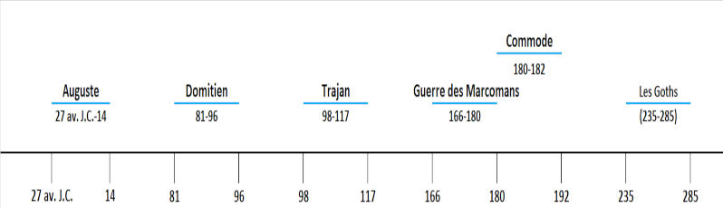 Organisation militaire sur le Danube après TrajanRetrouvez le résumé de cette partie au sein du synopsis : AugusteLa défense des frontières dans le bassin du Danube ne fut pas modifiée comme on pouvait s'y attendre après la transformation de la Dacie en province romaine et la ligne des forts ne subit pas de changements essentiels; la nouvelle province fut considérée dans son ensemble comme une position excentrique, qui n'était rattachée directement à l'empire romain que sur le Danube au Sud, et qui, par les trois autres côtés, pénétrait dans la région barbare. La plaine de la Theiss qui s'étend entre la Pannonie et la Dacie fut laissée aux lazyges; on a trouvé des restes d'anciens retranchements qui partaient du Danube, franchissaient la Theiss, aboutissaient aux montagnes de la Dacie, et bornaient au Nord le pays des Iazyges: mais on ne sait rien de certain sur l'époque ni sur les constructeurs de ces retranchements. La Bessarabie est aussi traversée par une double ligne de fortifications, qui court du Prut au Dniester pour se terminer à Tyra, et qui semble d'origine romaine, si nous en croyons les renseignements insuffisants qui nous sont parvenus sur cette question1. S'il en est ainsi, la Moldavie, la moitié méridionale de la Bessarabie, et la Valachie tout entière ont été annexées à l'empire romain. Mais cette annexion n'a pu être que nominale; la domination romaine ne s'est établie, en réalité, que difficilement dans tous ces pays. Tout au moins on n'a découvert aucun vestige certain de colonisation romaine dans la Valachie orientale, dans la Moldavie ou dans la Bessarabie. En tout cas, le Danube resta dans cette contrée, plus encore que le Rhin en Germanie, la limite de la civilisation romaine et le principal soutien de la défense des frontières. Les positions furent considérablement renforcées sur le fleuve. Ce fut un bonheur pour Rome que le flot des peuples s'arrêtât dans la région du Rhin, tandis qu'il montait sur le Danube, et qu'on pût transporter ailleurs les troupes devenues inutiles en Germanie. Sous Vespasien il n'y avait probablement que six légions dans les pays danubiens; leur nombre fut porté à dix par Domitien et Trajan; la conséquence en fut que les deux grands commandements de Mésie et de Pannonie furent divisés, le premier sous Domitien, le second sous Trajan, en sorte qu'avec celui de Dacie, nouvellement créé, les commandements du bas Danube se trouvèrent au nombre de cinq. Au début il semble que l'on ait laissé en dehors de l'empire le coude formé par le fleuve au-dessous de Durostorum (Silistrie), la moderne Dobrudscha, et qu'à partir de l'endroit appelé aujourd'hui Rassowa, où le Danube s'approche à sept milles allemands (52 kilom.) de la mer, pour se tourner ensuite vers le Nord presque à angle droit, la ligne du fleuve fût remplacée par une route fortifiée, comme celles de la Bretagne, qui atteignait la côte près de Tomis2. Ce coude fut pourtant rattaché, au moins depuis Hadrien, au système de défense des frontières romaines; car on trouve désormais dans la Basse-Mésie, qui vraisemblablement ne possédait pas avant Trajan de garnison permanente considérable, les trois camps de légions de Novae (près de Sistova), de Durostorum (Silistrie) et de Troesmis (Iglitza, près de Galatz); ce dernier est situé en avant de ce coude du fleuve. On renforça les défenses contre les Iazyges, en ajoutant aux camps de Singidunum et de Viminacium dans la Haute-Mésie, celui d'Acumincum placé dans la Basse-Pannonie, au confluent de la Theiss et du Danube. Au contraire la Dacie ne fut alors occupée que faiblement. L'ancienne capitale, Sarmizegethusa, transformée en colonie par Trajan, n'était pas très éloignée des principaux passages qui conduisaient au-delà du fleuve, dans la Haute-Mésie: c'est là, ainsi que sur le cours moyen du Marisus, et, de l'autre côté de cette rivière, dans le pays des mines d'or, que les Romains s'étaient établis avec profit: c'est aussi dans cette région, près d'Apulum (Karlsburg) que fut fondé, tout au moins peu de temps après, le quartier-général de la seule légion qui, depuis Trajan, tint garnison en Dacie. Plus au Nord les Romains s'emparèrent immédiatement de Potaïssa (Torda) et de Napoca (Klausenburg); mais les grands centres militaires de Pannonie et de Dacie ne furent transportés que peu à peu vers le Nord. La légion de basse Pannonie quitta Acumincum pour Aquincum, aujourd'hui Ofen, position militaire des plus importantes; cet événement ne fut pas postérieur à Hadrien, et peut-être eut lieu sous son règne. C'est aussi à la même époque qu'une des légions de Haute-Pannonie vint occuper Brigetio (en face de Komorn). Sous Commode toute colonisation fut interdite au Nord de la Dacie sur un espace large d'un mille allemand; ce fait concorde avec l'organisation de la frontière, après la guerre des Marcomans dont nous parlerons plus loin. Alors aussi sans doute ont été construites les lignes fortifiées qui protégeaient les limites de l'empire, comme en Haute-Germanie. Sous le règne de Sévère, une des légions affectées jusqu'alors à la Mésie-Inférieure fut transportée sur la frontière septentrionale de la Dacie, dans les environs de Potaissa (Thorda). Mais, même après tous ces changements la Dacie resta une position avancée couverte de montagnes et de retranchements, sur la rive gauche du Danube, à propos de laquelle on pouvait se demander si elle était utile ou nuisible à la défense générale du territoire romain. En réalité Hadrien a pensé à abandonner ce pays; il en considérait l'annexion comme une faute; mais cette annexion une fois accomplie, on resta dans la Dacie, sinon à cause de ses riches mines d'or, du moins parce que la civilisation romaine se développait rapidement dans le bassin du Marisus. Mais il différa la construction d'un pont de pierre sur le Danube; il craignait qu'il ne fût beaucoup p