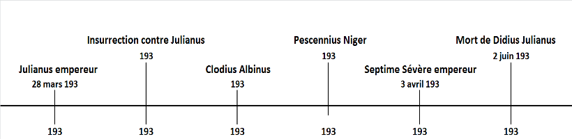 Sources historiques : Edward Gibbon Vous êtes dans la catégorie : Empire Chapitre suivant : Septime Sévère (2 juin 193 - 4 février 211) Chapitre précédent : Pertinax (1er janvier 193 - 28 mars 193) Dans ce chapitre : 11 rubriques; 5 002 mots; 26 360 caractères (espaces non compris); 31 297 caractères (espaces compris) Format 100% digital de cette rubrique (via l'espace membre) | |||||
