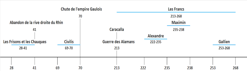 Les FrancsRetrouvez le résumé de cette partie au sein du synopsis : AugusteCes Germains sont les Francs, qui apparaissent ici pour la première fois, mais que Rome avait dû combattre déjà sous un autre nom. Sans doute l'assimiliation, déjà faite dans l'antiquité, de ces francs avec les peuplades sur le Rhin inférieur, en partie avec les Chamaves établis auprès des Bructères, en partie avec les Sicambres déjà cités et soumis aux romains, est incertaine et tout au moins insuffisante; mais il est beaucoup préférable d'identifier aux Francs plutôt qu'aux Alamans, les Germains de la rive droite du Rhin devenus sujets de Rome et les tribus germaniques écartées du fleuve qui auraient pris alors tous ensemble l'offensive contre les romains sous le nom général de "Francs Libres". |