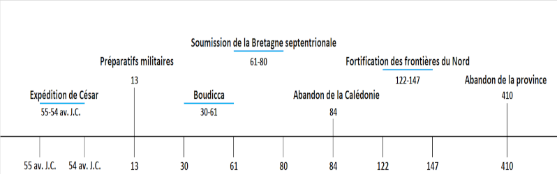 Préparatifs militaires pour l'occupation de l'îleRetrouvez le résumé de cette partie au sein du synopsis : AugusteOn ne pouvait pas occuper la Bretagne sans affaiblir en même temps l'armée impériale; c'était bien l'opinion des hommes d'Etat qui conseillaient l'expédition. On destina à la nouvelle campagne1 trois des légions du Rhin et une légion du Danube; mais deux légions furent alors créées et ajoutées aux armées germaniques. On choisit comme chef de l'expédition, et aussi comme premier gouverneur de la province un soldat habile, Aulus Plautius; les troupes partirent pour l'île en l'an 13. Cependant les soldats se mutinèrent, moins par crainte de l'ennemi qu'à cause de l'exil dans une île lointaine qu'on leur imposait. Un des chefs du gouvernement, qui avait été peut-être l'âme de l'entreprise, le secrétaire du cabinet impérial, Narcisse, voulut ranimer leur courage : ils saluèrent cet esclave d'acclamations moqueuses et l'empêchèrent de parler, mais ils firent ce qu'il voulait et s'embarquèrent. 1. Les trois légions du Rhin sont : la IIe Augusta, la XIVe et la XXe; de Pannonie vint la IVe Hispania. Ces quatre légions étaient encore en Bretagne au commencement du règne de Vespasien; au moment de la guerre contre Civilis, cet empereur rappela la XIVe, qui ne retourna pas dans l'île mais y fut probablement remplacée par la IIe Adjutrix. Celle-ci fut sans doute transférée en Pannonie sous Domitien; la IX e fut licenciée sous Hadrien qui lui substitua la VIe Victrix. Les deux autres légions, la IIe Augusta et la XXe sont restés en Angleterre jusqu'à la chute de l'empire romain. |