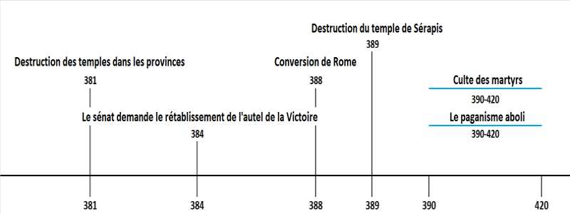 Destruction totale du paganismeRetrouvez le résumé de cette partie au sein du synopsis : Dioclétien et ConstantinLa ruine du paganisme dans le siècle de Théodose est peut-être l'exemple unique de l'extinction totale d'une superstition ancienne et généralement adoptée. Les chrétiens, et principalement le clergé, avaient souffert avec impatience les sages délais de Constantin, et la tolérance universelle du premier des Valentiniens. Ils regardaient leur victoire comme imparfaite et peu sûre, tarit qu'on laisserait subsister leurs adversaires. Saint Ambroise et ses confrères employèrent leur influence sur la jeunesse de Gratien et sur la piété de Théodose, à inspirer des maximes de persécution à leurs augustes prosélytes. On établit deux principes spécieux de jurisprudence religieuse, d'où les prélats tirèrent une conclusion sévère et rigoureuse contre tous les sujets de l'empire qui persévéraient encore dans les cérémonies du culte de leurs ancêtres : 1� que les magistrats sont en quelque façon coupables des crimes qu'ils négligent de prévenir ou de punir; 2� que l'idolâtrie des divinités fabuleuses et des démons est le crime le plus offensant pour la majesté du Créateur. Le clergé s'autorisait des lois de Moïse et de l'histoire des Juifs, et les appliquait d'une manière irréfléchie et peut-être erronée au règne plein, de douceur, et à l'empire du christianisme. Il excita, le zèle des empereurs à soutenir leur propre honneur en même temps que celui de la Divinité, et tous les temples du monde romain furent détruits soixante ans après la conversion de Constantin. |