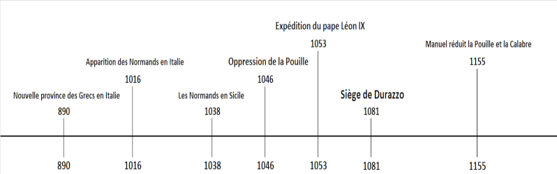 Robert fait une invasion dans l'empire d'OrientRetrouvez le résumé de cette partie au sein du synopsis : Troisième invasionLa conquête de la Sicile avait été plus glorieuse qu'utile pour Robert Guiscard : la possession de la Pouille et de la Calabre ne suffisait pas à son ambition, et il résolût de saisir ou de faire naître une occasion d'envahir ou peut-être de subjuguer l'empire d'Orient. Un divorce obtenu sous prétexte de consanguinité avait éloigné sa première épouse, la compagne de son humble fortune, et Bohémond, issu de ce premier mariage, se trouvait destiné à imiter son illustre père plutôt qu'à lui succéder. Sa seconde femme était fille des princes de Salerne; les Lombards consentirent à reconnaître pour son héritier Roger, sorti de ce second mariage : cinq filles que Guiscard eut d'ailleurs de la princesse de Salerne, furent toutes honorablement mariées; et l'une d'elles fut fiancée en bas âge au jeune et beau Constantin, fils et héritier de l'empereur Michel; mais une révolution ébranla le trône de Constantinople; la famille royale de Ducas fut emprisonnée dans le palais ou dans le cloître; et Robert, affligé du malheur de sa fille et de l'expulsion de son allié, médita des projets de vengeance. Un Grec, qui se disait père de Constantin, parut bientôt à Salerne, et raconta l'histoire de son détrônement et de son évasion. Le duc ne méconnut pas cet ami malheureux; il l'environna de la pompe et le revêtit des titres de la dignité impériale. Michel parcourut en triomphe la Pouille et la Calabre : les peuples le reçurent avec des larmes et des acclamations; et le pape Grégoire VII exhorta les évêques à concourir, par leurs sermons, et les catholiques par le secours de leurs bras, au rétablissement de ce prince. Ses conversations avec Robert étaient fréquentes et familières; la valeur des Normands et les trésors de l'empire grec donnaient quelque fondement à leurs promesses réciproques. Cependant, de l'aveu des Grecs et des Latins, ce Michel n'était qu'un fantôme et un imposteur : c'était un moine échappé de son couvent où un domestique qui avait servi dans le palais. L'adroit Guiscard avait imaginé cette fourberie : il comptait qu'après avoir donné ainsi une apparence de justice à ses armes, le faux empereur rentrerait, au premier signe, dans l'état obscur d'où il venait de le tirer; mais on ne pouvait déterminer la croyance des Grecs que par la victoire, et l'ardeur des Latins n'égalait pas leur crédulité : les soldats normands voulaient jouir en paix du fruit de leurs travaux, et la lâcheté des Italiens frémissait de la seule idée des périls connus et inconnus d'une expédition au-delà de la mer. Robert employa, sur ces nouvelles levées, le pouvoir des présents et des promesses, les menaces de l'autorité civile et de l'autorité ecclésiastique; et quelques actes de violence ont donné lieu au reproche qui lui fut fait d'avoir enrôlé sans distinction et sans pitié, des vieillards et des enfants. Après deux années employées sans relâche en préparatifs, l'armée de terre et les forces navales s'assemblèrent à Otrante, dernier promontoire de l'Italie, situé à l'extrémité du talon de la botte; Robert s'y rendit accompagné de sa femme, qui combattit à ses côtés, de son fils Bohémond, et de l'imposteur qu'on donnait pour l'empereur Michel. Treize cents chevaliers normands, ou élevés à leur école, étaient le nerf de cette armée composée d'environ trente mille hommes de toute espèce. Cent cinquante navires furent destinés à transporter les soldats, les chevaux, les armes, les machines de guerre et les tours de bois couvertes de peaux non travaillées. Ces bâtiments avaient été construits en Italie, et la république de Raguse, devenue l'alliée de Robert, avait fourni les galères. |