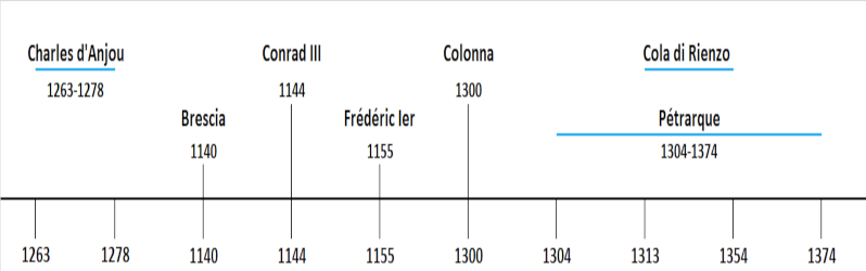 Son couronnement poétique à RomeLa cérémonie de son couronnement fut célébrée au Capitole, par le suprême magistrat de la république, son protecteur et son ami. On y vit douze jeunes patriciens en habit écarlate, et six représentants des plus illustres familles, en robes vertes, avec des guirlandes de fleurs. Le sénateur comte d'Anguillara, allié des Colonnes, monta sur son trône, environné des princes et des nobles; et Pétrarque, appelé par un héraut, se leva. Après avoir fait un discours sur un texte de Virgile, et formé à trois reprises des voeux pour la prospérité de Rome s'agenouilla devant le trône, et le sénateur, en lui mettant une couronne de laurier sur la tête, l'accompagna de ce mot plus précieux: C'est la récompense du mérite. Le peuple s'écria: Longue vie au Capitole et au poète ! Pétrarque répandit par un sonnet à la gloire de Rome, effusion du génie et de la reconnaissance. Le cortège se rendit au Vatican, et le poète déposa devant la châsse de saint Pierre la couronne profane qu'il venait d'obtenir. Le diplôme qu'on offrait à Pétrarque lui accordait le titre et les privilèges de poète lauréat qui ne subsistaient plus depuis treize siècles: on l'autorisait à porter à son choix une couronne de laurier, de lierre ou de myrte, à prendre l'habit de poète, à enseigner, disputer, interpréter, composer dans tous les lieux et sur tous les sujets de littérature. Le sénat et le peuple ratifièrent cette grâce, et on y ajouta le caractère de citoyen de Rome, comme une récompense de son zèle pour la gloire de cette ville. Cette distinction était honorable, et il la méritait. Il avait puisé dans les écrits de Cicéron et de Tite-Live les idées de ces patriotes des beaux temps de la république: son imagination ardente donnait à toutes les idées la chaleur du sentiment, et faisait de tout sentiment une passion. La vue des sept collines et de leurs ruines majestueuses fortifia ces vives impressions. Il aima un pays qui, après l'avoir couronné, l'adoptait pour un de ses enfants. La pauvreté et l'abaissement de Rome excitèrent l'indignation et la pitié de ce fils reconnaissant; il dissimula les fautes de ses concitoyens; il applaudissait avec enthousiasme aux derniers héros et aux dernières matrones de la république; et, entraîné par le souvenir du passé et des espérances sur l'avenir, il se plaisait à oublier la misère du temps où il vivait, Rome était toujours à ses yeux la maîtresse légitime du monde: le pape et l'empereur, son évêque et son général, avaient abandonné leur poste, par une honteuse retraite sur les bords du Rhône et du Danube; mais la république, en reprenant ses vertus, pouvait rétablir sa liberté et sa domination. Tandis que l'enthousiasme et l'éloquence le livraient ainsi à leurs brillantes chimères, une révolution qui parut prête à les réaliser vint étonner Pétrarque, l'Italie et l'Europe. Je vais parler de l'élévation et de la chute du tribun Rienzi: le sujet a de l'intérêt, les matériaux sont en grand nombre, et le coup d'oeil d'un barde patriote animera quelquefois le récit détaillé, mais simple, du Florentin et surtout du Romain qui ont traité ce morceau d'histoire. |